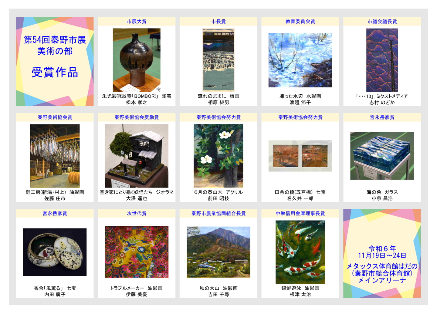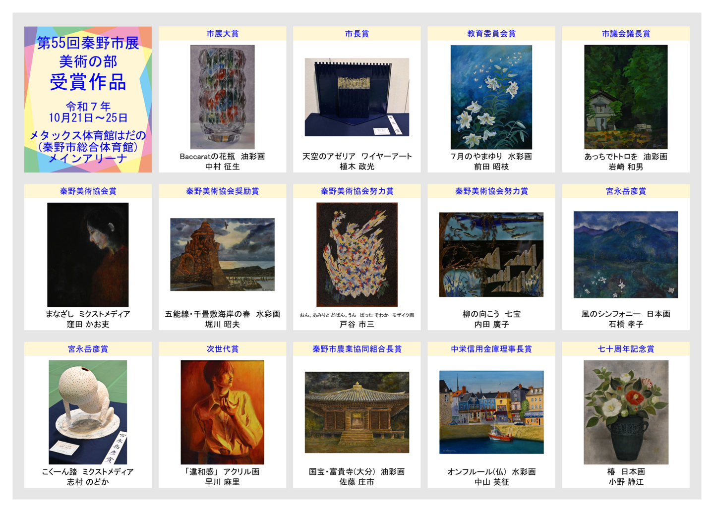 HOME | 市展の受賞作品ご紹介 第55回秦野市展 美術の部 会場風景 第55回秦野市展 美術の部 受賞作品 受賞おめでとうございます 令和7年10月21日~25日メタックス体育館はだの(秦野市総合体育館)メインアリーナ 第54回秦野市展 美術の部 会場風景 第54回秦野市展 美術の部 受賞作品 受賞おめでとうございます 令和6年11月19日~24日メタックス体育館はだの(秦野市総合体育館)メインアリーナ 第53回秦野市展 美術の部 会場風景 第53回秦野市展 美術の部 受賞作品 受賞おめでとうございます 令和5年11月15日~19日クアーズテック秦野カルチャーホール